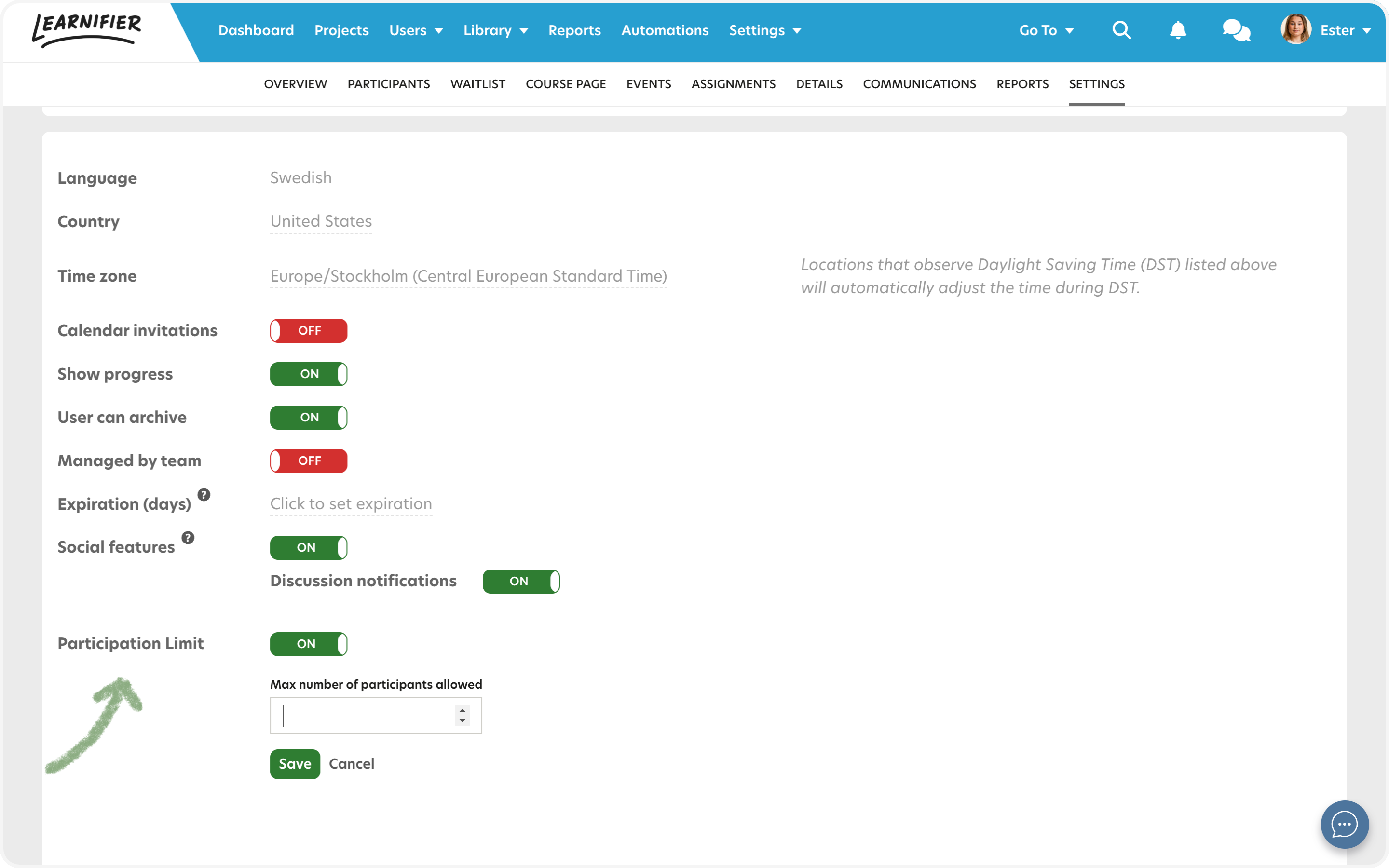 If you wish to limit the number of participants in a course, go to the “Settings” tab of the course and scroll down to “Participation limit”. Please also consider using the waitlist if you limit the number of course participants.