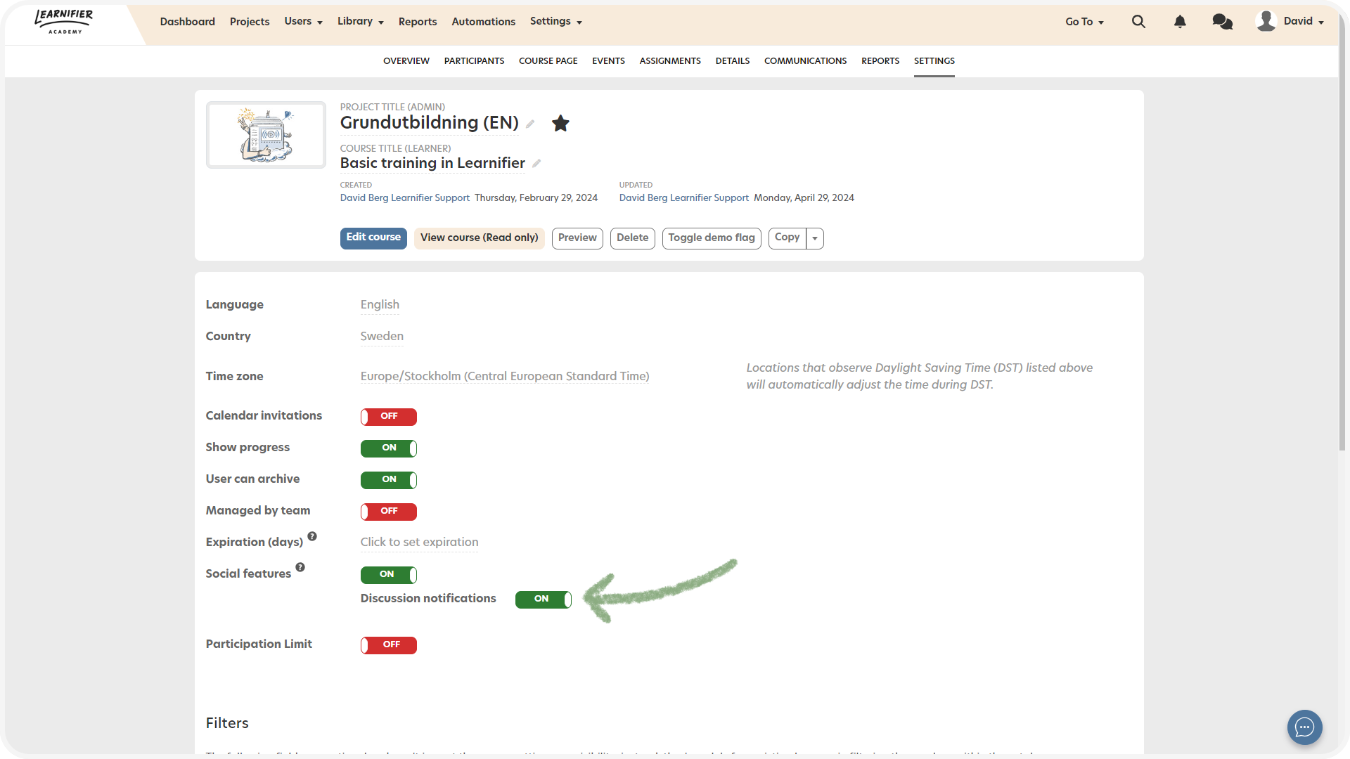 OBS: När sociala funktioner är aktiverade kommer ett e-postmeddelande att skickas med uppdateringar om olika kommentarer till deltagarna. Med “Discussion Notifications” har du möjlighet att aktivera/inaktivera e-postaviseringar som skickas till dina deltagare.